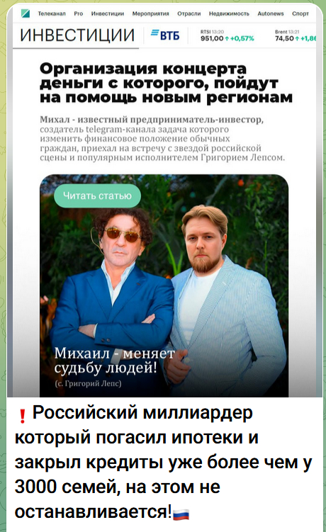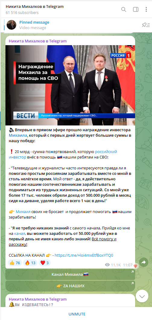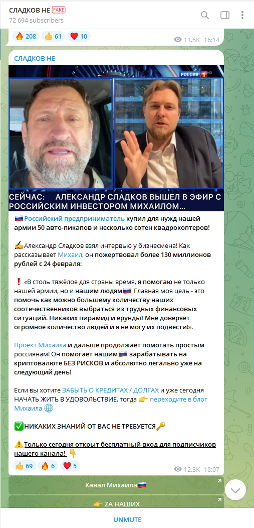 Привет! Замечаю в телеграмме активность по раскрутке мошенников на "патриотичной" волне. Технология состоит в том, что мошенники создают фальшивый канал медийной личности, набивают его патриотическим контеном и вставляют между вполне себе патриотических публикаций рекламу мошеннического канала.