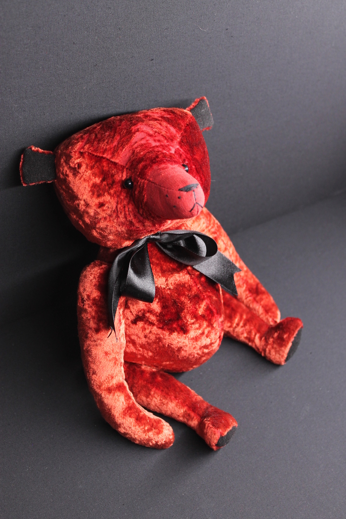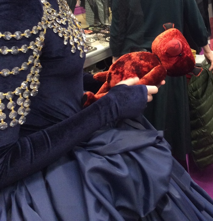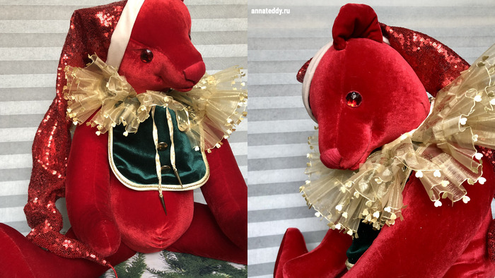 Огромный (50см. в сидячем и 70 см. в стоячем положении!), яркий мишка, которого мама сшила специально для новогодней выставки "Мир кукол" (прямо сейчас проходит в Питере, можно и нужно посетить, вся инфа есть в сети - сюда не принесла, вдруг это будет как реклама). Материалы: бархат, шерсть, опилки, холлофайбер, стеклянный гранулят, глаза (стразы, пластик), шплинтовое соединение (5 точек). Съёмные аксессуары (одежда): органза, ткань с пайетками, золотой шнур, пуговицы.