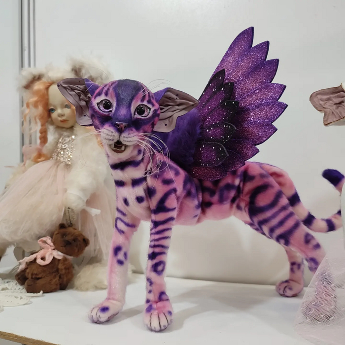 Размер 50 см., 25 см. в сидячем положении. Материалы: миништоф, опилки, лузга гречи, стеклянный гранулят, деревянные бусины, глаза: стекло, соединение: 5 шплинтов и 5 шарниров. Съёмные аксессуары и одежда: хлопок, бисер, ткань с пайетками, бусины.