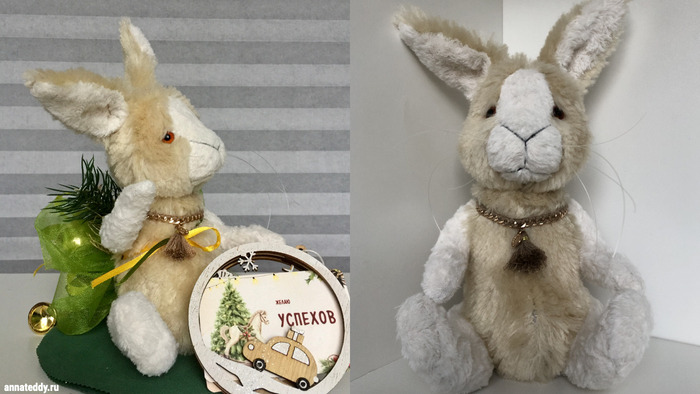 Ещё один подарочный Зайка, символ 2023 года. Размер: 21 см. Материалы: вискоза, искусственный мех, стеклянный гранулят, шплинтовое соединение (5 точек), опилки, глаза: стекло.