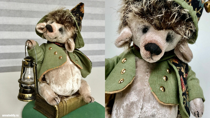 Сшит в подарок для маминой подруги, которая фанат ёжиков во всех проявлениях и коллекционирует их много лет. Размер: 14 см. Материалы: итальянский мохер "Ёж", винтажный плюш, 5 шплинтов, металлический гранулят, глаза: стекло. Аксессуары: фонарь (пластик, проволка), подставка: миниатюрная скульптура "Книга" (бронза), натуральные ткани, картон.