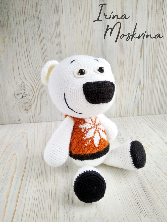 Связан крючком. Пряжа - 100% акрил. Набивка - холлофайбер. Глаза - бусины и фетр. Да-да, знаю что бусины здесь не очень хорошо смотрятся. Увы, нормальных глазок такого размера под рукой не было, а во время изготовления медведя мы с дочкой немного приболели и идти в магазин не было возможности. Наверно немного позже сделаю ему-таки нормальные глазки)