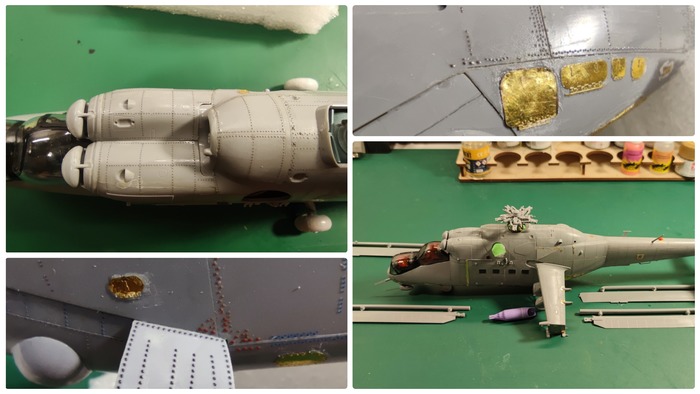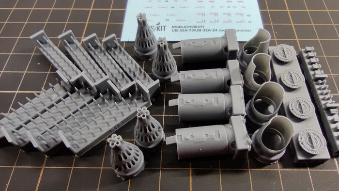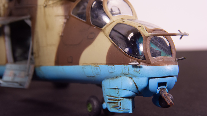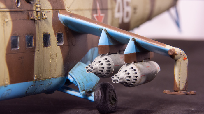 А потом случился летний перерыв. Отпуск, командировка, дача... было не до вертолёта. Но вот я вернулся, появились свободные спокойные вечера и стало возможно приступить к покраске. Обнаружилось страшное: я оставил в зажимах блоки НУР, что привело к необратимой деформации тонких стенок пусковых труб =(. Пришлось заказывать новые и выбор остановился на RES.kit из Украины. Очень годные наборы, хотя и слишком, на мой взгляд, расчленённые. Заодно заменил носовую пулемётную установку.
