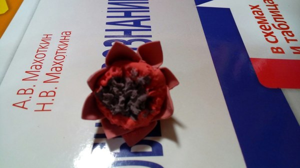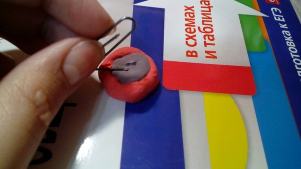 5 шаг. Пока засыхают лепестки, мы сделаем серединку. Берем два куска материала, темнее лепестков. Самый темный материал катаем в шарик и придадим им форму низкого цилиндра. Массу посветлей "обматываем" вокруг цилиндра. Потом берем скрепку и поддеваем серединку, вынося массу наверх, как на фото.