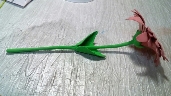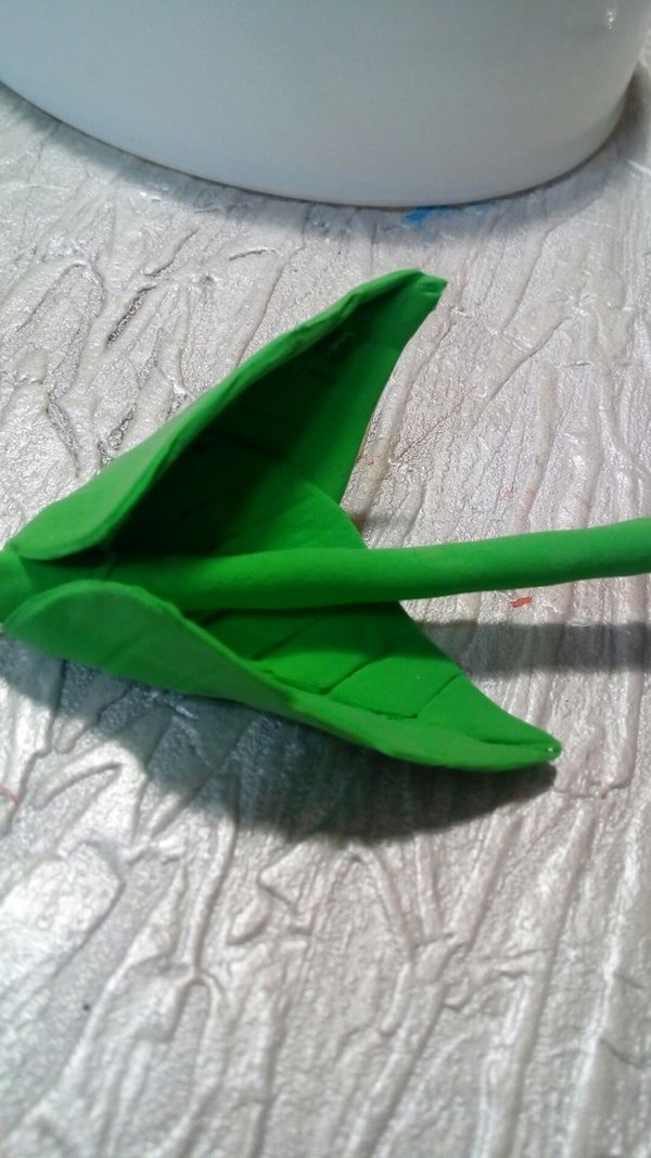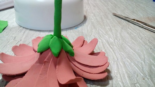 7 шаг. К получившейся серединке, с обратной стороны прикрепляем кусочек зеленой массы и уже к ней прикрепляем стебель. Оставляем засыхать.