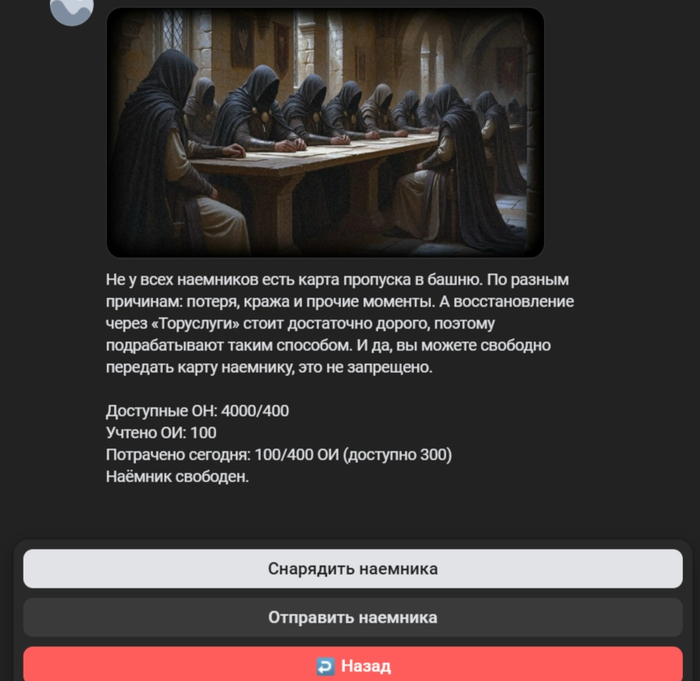 Долго не хотел добавлять что-то подобное, просто потому что афк-режимы — полная фигня в 99% случаев. Аля, поставь своего персонажа 9999 уровня подрабатывать в трактире и прочее. С афк-режимом действительно мало что можно придумать. Но я придумал хоть какую-то выделяющую особенность из общей массы. - Чтобы начать фармить афк, вам требуется сначала потратить определенное количество ОИ (очки исследований), чтобы получить ОН (очки наемников). Всё считается автоматически. Ограничение в день - 400 минут. - Далее заходите в гильдию наемников, и там новая кнопка «Отправить наемников». Вы можете дать временную экипировку своему наемнику, чтобы его фарм был эффективнее, но есть маленький шанс потерять один из элементов. - Наемник забирает ваш пропуск в башню, и вы не можете в нее войти, но при этом можете свободно передвигаться по городу и иметь доступ ко всем ее функциям, восстанавливать ОИ или побегать по хаос-порталам. - При этом то, что приносит наемник, это приятный бонус к общему фарму, не сущие копейки, но и не чрезмерный избыток. - Ну а сама фишка — после того как наемник возвращается, он присылает вам отчет, в котором расписаны позитивные и негативные события, которые с ним случились. Они добавляют или отнимают часть ядер. В итоге с отчета можно будет еще и поржать, и это будет создавать иллюзию того, что он действительно все это переживал, так же как вы, во время исследований этажей.Надеюсь вам понравится такое небольшое переосмысление базового режима в текстовых играх.#tor#towerofrandom