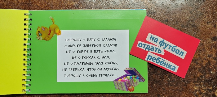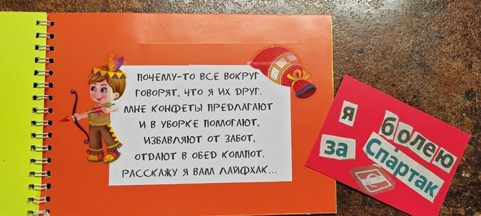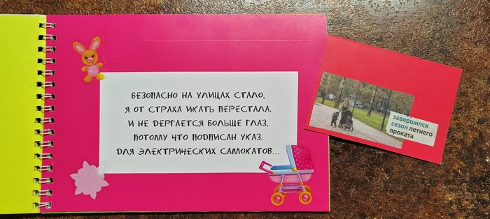 Основными идеологическими линиями стали: - стихотворный формат: детская же книжка, а стихи юными умами воспринимаются легче. Да и у меня с детства в минуты воодушевления проявлялась страсть к стихосложению; - яркое цветное оформление: из той же оперы, серость у малышей не в почете. Тем более нет у меня цветного принтера, подойдут заголовки и иллюстрации, вырезанные из газет; - эффект неожиданности: изюминка, которая, по моему замыслу, должна была сделать книжку более запоминающейся - финал стихотворения спрятан на карточке, которую нужно вынимать из страницы.