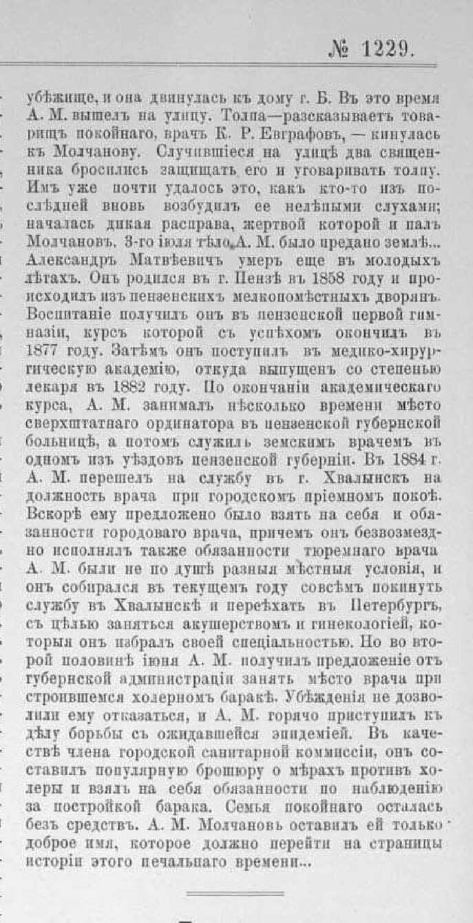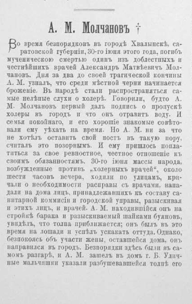 Правительственным врачом при борьбе с холерой был назначен Молчанов, бывший до того городовым врачом, не поладивший с городом, и в особенности не пользовавшиеся расположением низшего класса населения, мелких торговцев и домохозяев, за свой взыскательный и придирчивый характер.
