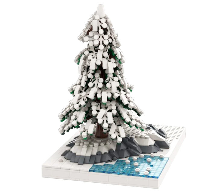 Набор из деталей аналогичных Lego для сборки заснеженной ёлки высотой 16 см и небольшого участка озера. Конструктор состоит из 960 деталей. Ссылка на него