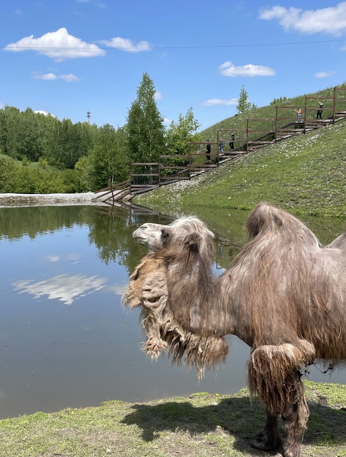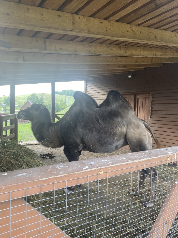 В зоопарке много разных животных, есть большой медведь в клетке, верблюды и все остальные животные, которых встретите в любом городском зоопарке.