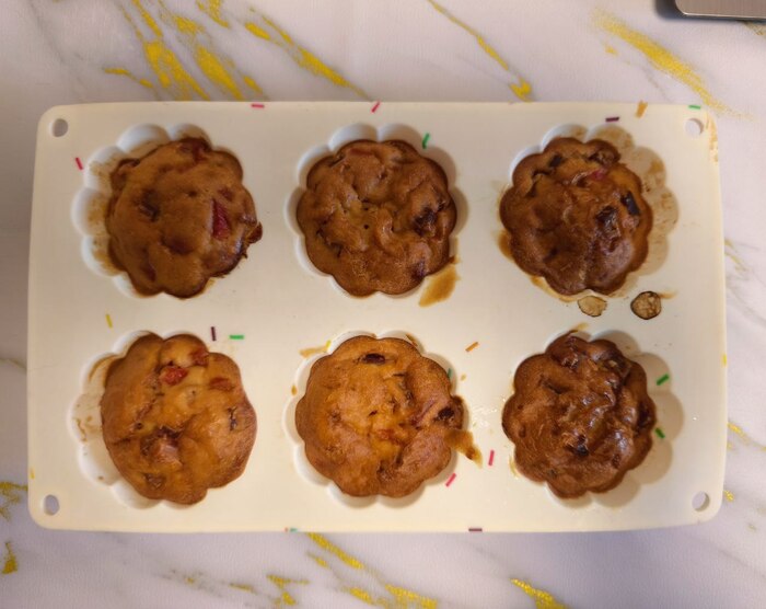 Подготовить формочки, уложить тесто. Я пеку в силиконовой форме для кексов.