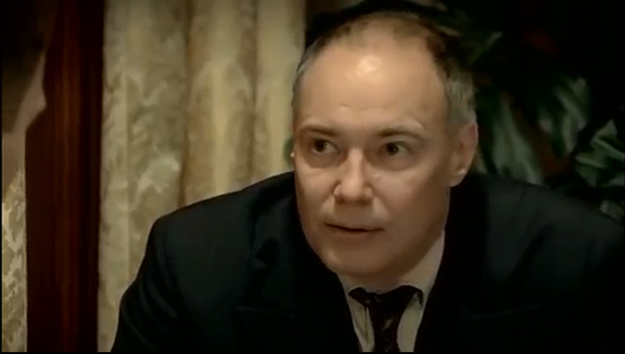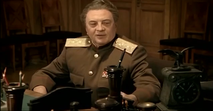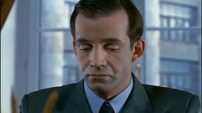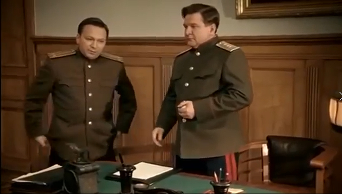 О, какая встреча. Мадянов собственной персоной, а то я уже скучать начал без него.. Играет актер Мадянов тут самого Виктора Семеновича Абакумова. Пока Абакумов делал утреннюю зарядку, к нему заходит секретарь и докладывает что к нему пришли на прием. В кабинет к Мадянову заходят три офицера.