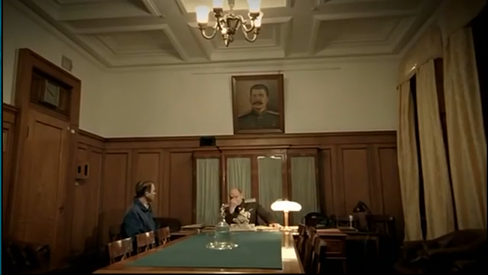 На короткое время, нам демонстрируют, как под мрачную музыку, где то бродит зловещий товарищ Сталин и первая серия на этом заканчивается...