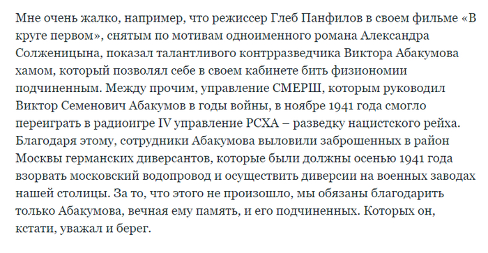 Ну вообще то непонятно а причем тут Абакумов если меру наказания в виде расстрела обычно назначал суд? Да и не был Виктор Абакумов вот таким хамом, как его режиссер Глеб Панфилов показал. Вот что про это говорит генерал-майор Николай Калягин.