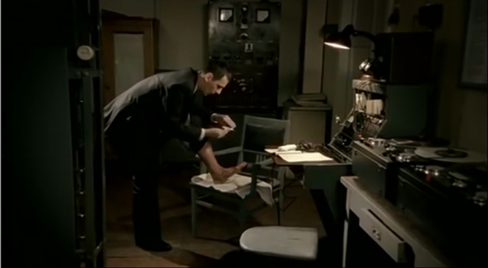 Нам показывают двух злобных упырей из МГБ, один обрабатывает ногу, другой пишет доклад для семинара по истории партии. Ну а Певцов уже находится в телефонной будке и набирает номер, у слухачей загорится лампочка тревоги. Певцов набирает номер посольство США, принимается говорить, а беседа записывается на пленку.
