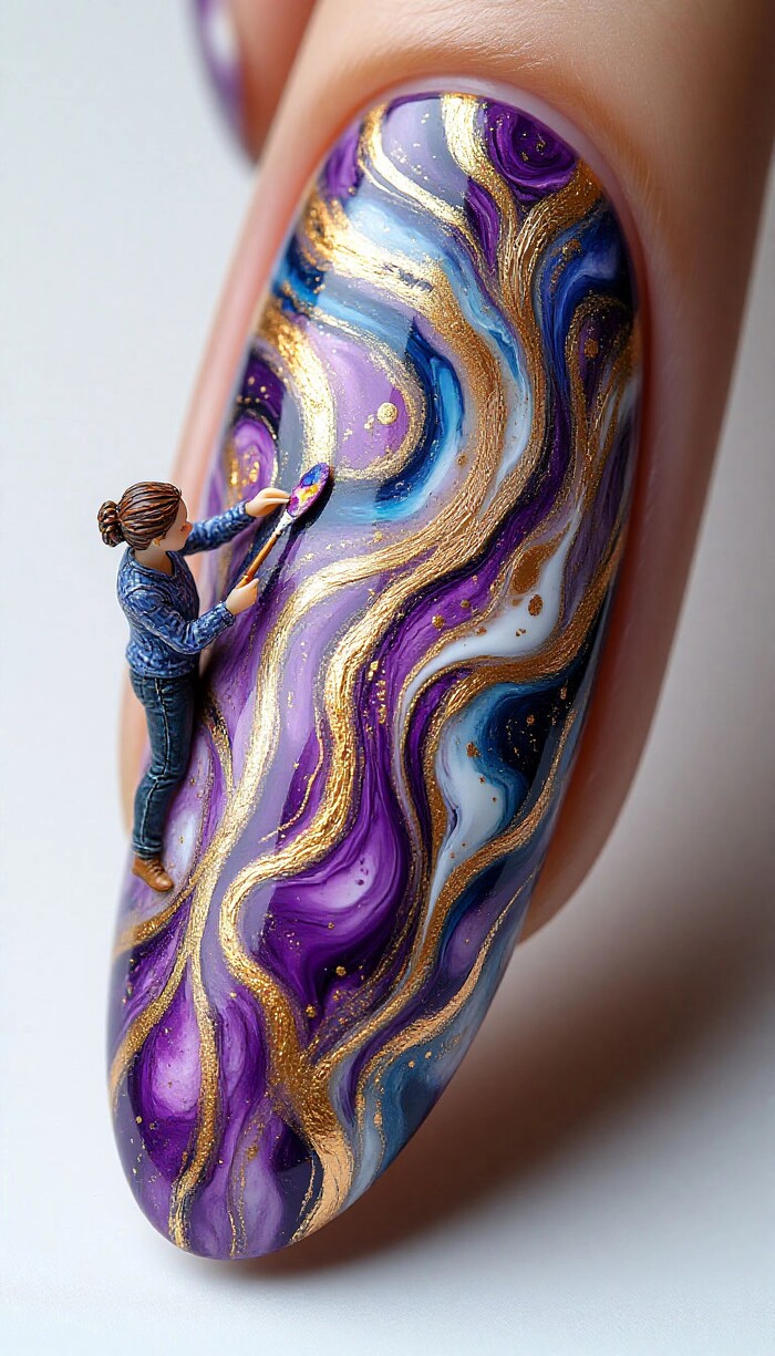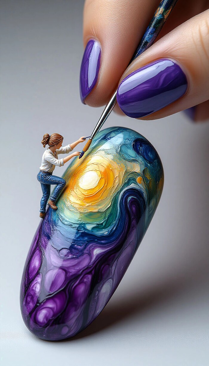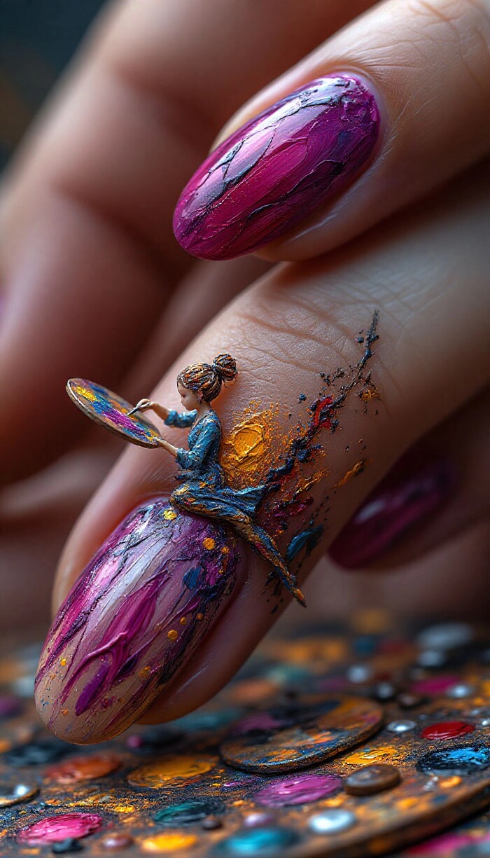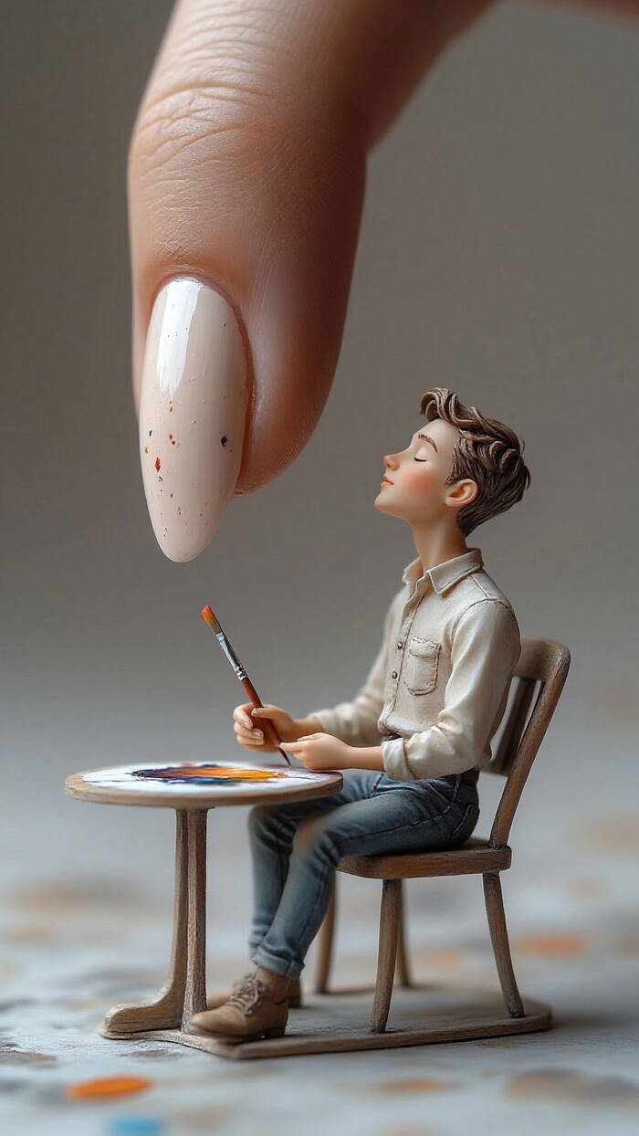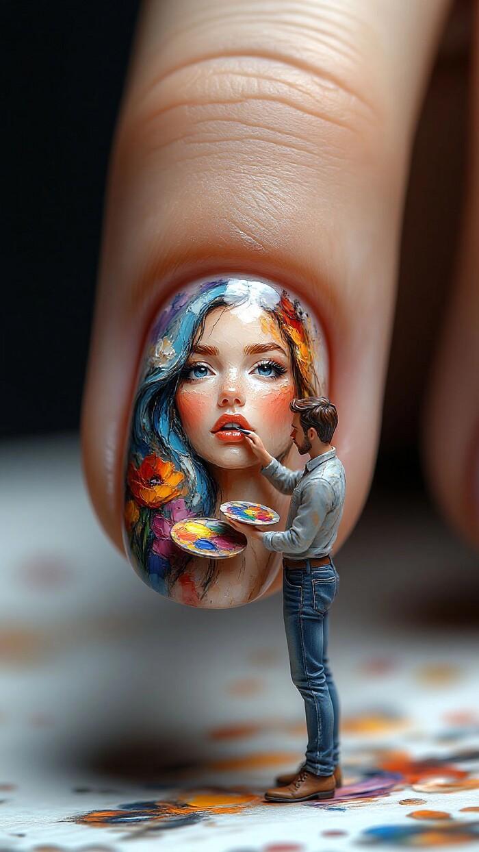 на пустом белом фоне миниатюрный художник с палитрой в руке рисует картину на гигантском женском ногте