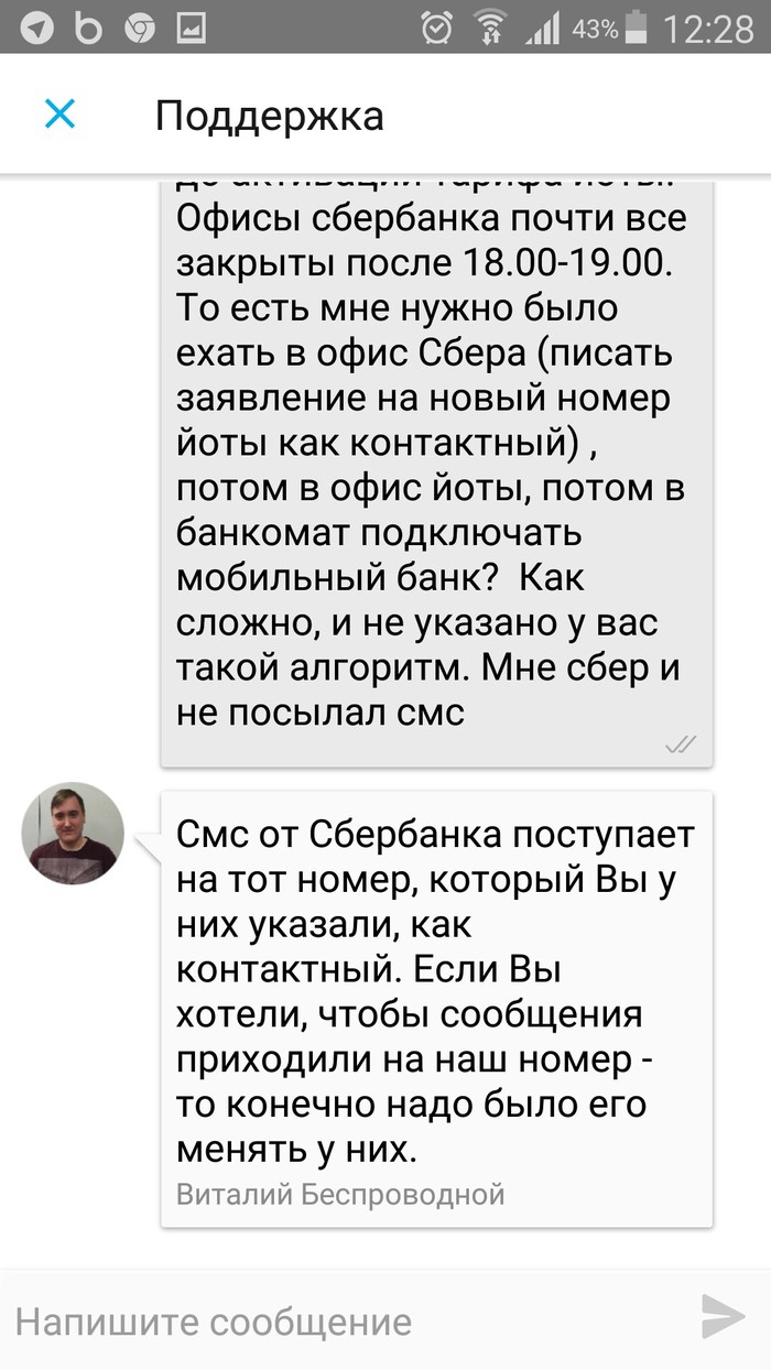 Однако узнал я это после переписки и общения с техподдержкой Сбербанка и Йоты. Йота кивала на Сбер, а Сбер условно отморозился , цитата: