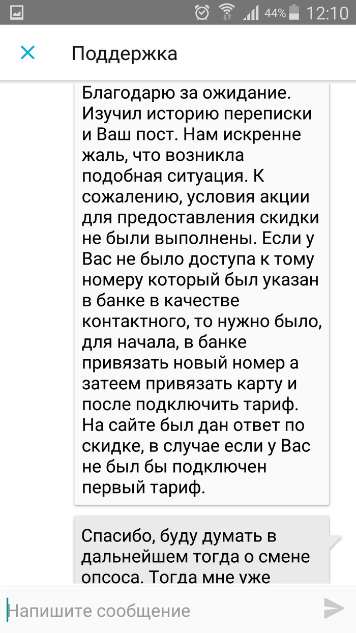 "Благодарю за ожидание. Изучил историю переписки и Ваш пост. Нам искренне жаль, что возникла подобная ситуация. К сожалению, условия акции для предоставления скидки не были выполнены. Если у Вас не было доступа к тому номеру который был указан в банке в качестве контактного, то нужно было, для начала, в банке привязать новый номер а затеем привязать карту и после подключить тариф. На сайте был дан ответ по скидке, в случае если у Вас не был бы подключен первый тариф."(с) Йота