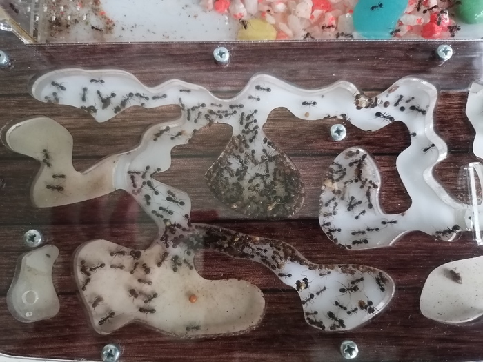 Конечно, муравейник слегка разрушился, когда я подняла поднос, но в целом все прекрасно видно. И это не просто лабиринт, муравейник внутри имеет сложное устройство. Там есть склады для еды, причем разные для зерна и для мясной пищи. Есть детская, где живут личинки. В самом низу покои королевы и комнаты для зимовки. А на самом верху, свой солярий, куда муравьи поднимаются погреться. В муравейнике есть даже свое кладбище и ферма с коровами, т. е. тлей.
