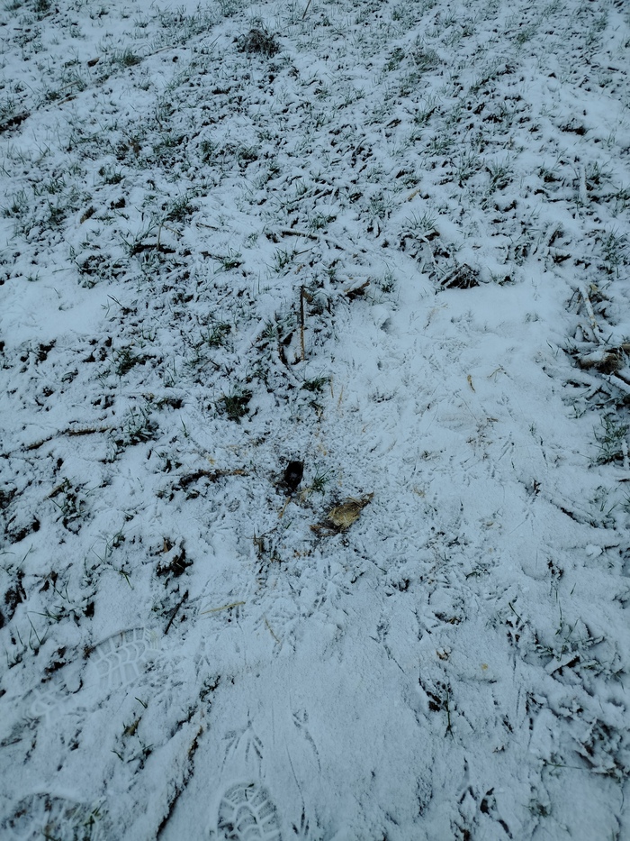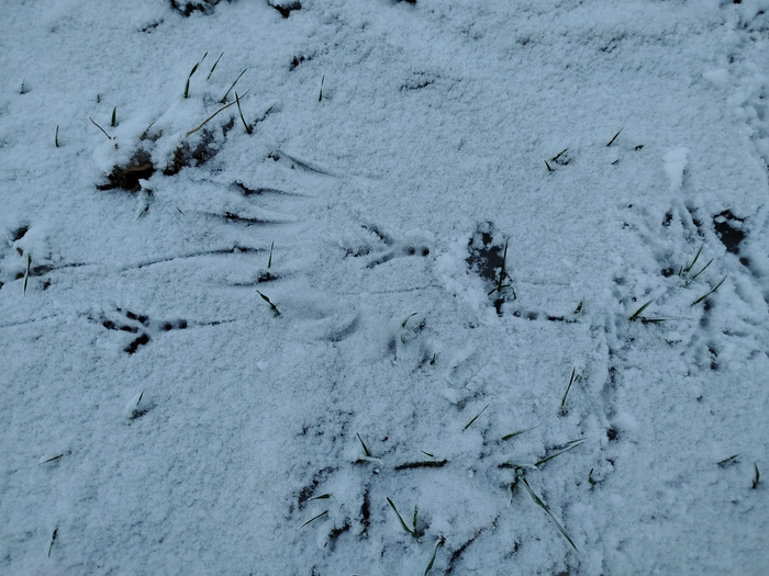 1. Возле распотрошённого кукурузного початка (общий план снять не удалось - телефон замёрз) был след от крыла. Видимо, кое-кто обедал и чуть-чуть подскользнулся 😁
