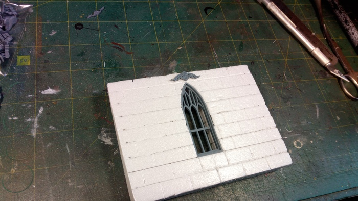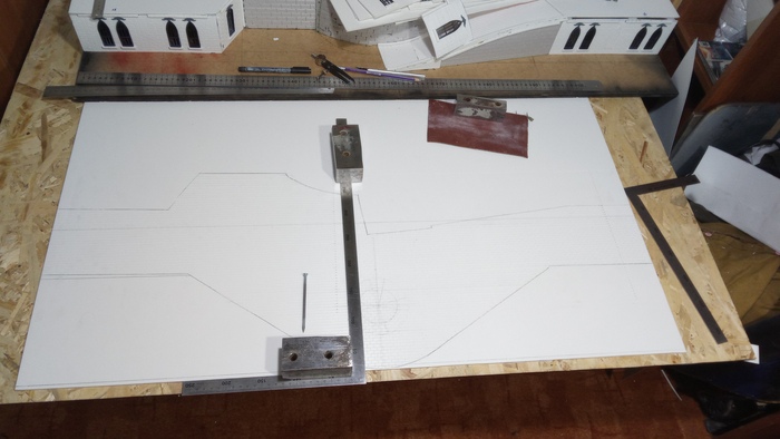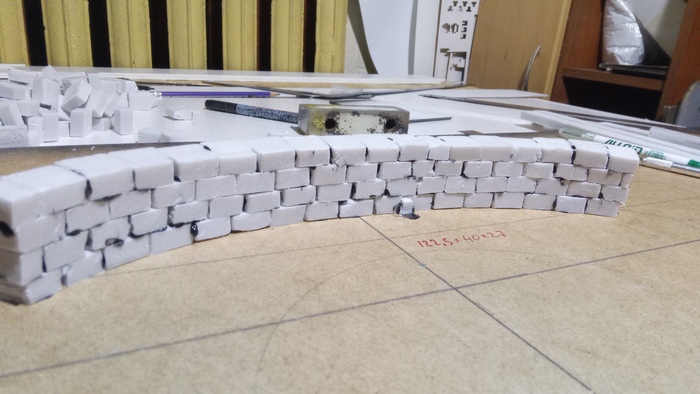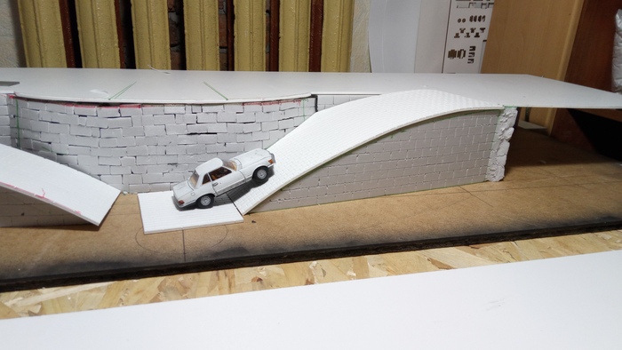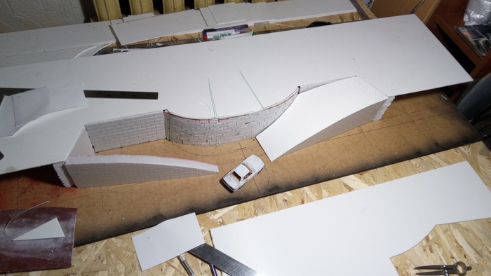 Основным материалом для изготовления я выбрал ПВХ пластик 3 мм толщиной. Наношу на основу из ПВХ пластика фактуру брусчатки, прикинул вариант заезда на второй ярус, не понравилось, пересмотрел решение с двумя заездами в пользу с одним заездом, но с более плавными линиями.