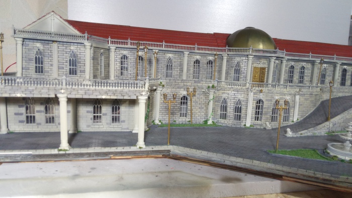Размеры: Длина основы 1.2м (120 см), глубина основы 0.4м (40 см), высота 0.27м (27см). Как видно из "чертежа", проект должен иметь 2 этажа, купольную конструкцию , колоны, фонари освещения по периметру, фонтан, заезд с возможностью парковки авто на втором ярусе. Мда задача конечно не из лёгких.