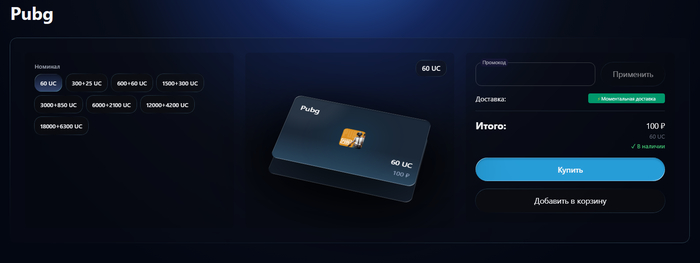 Перейдите на Code-top.shop, откройте раздел PUBG Mobile и выберите нужный номинал монет. В карточке товара указано точное количество UC, которое вы получите после активации.