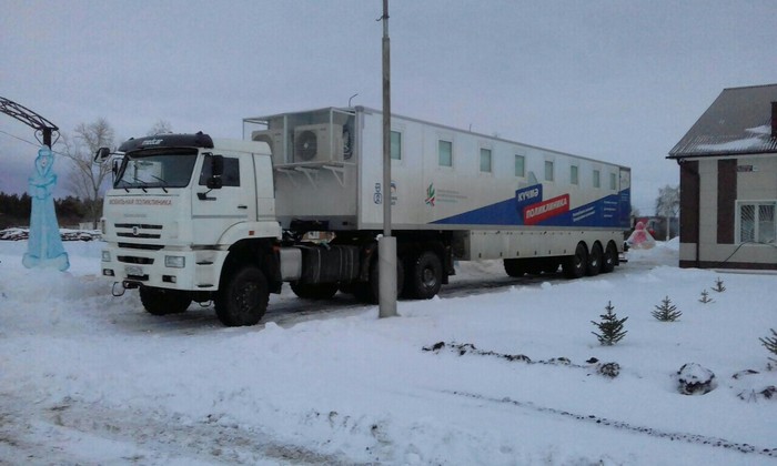Мобильная поликлиника- это автомобиль " КАМАЗ" с прицепом.