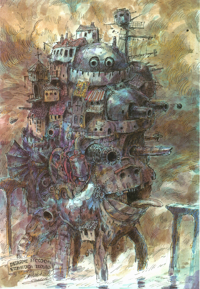 Наверное, второй по популярности (но не по значению) фильм студии Ghibli, основан на одноименном романе британской писательницы Дианы Уинн Джонс. Ведьма Пустоши превращает юную и робкую Софи в старуху, приревновав ее к прекрасному, но инфантильному волшебнику по имени Хаул. Став старухой, Софи обнаруживает в себе неведомую прежде силу и смелость и помогает Хаулу стать более уверенным в себе. Миядзаки не обходит стороной и больную для себя тему войны: действие картины разворачивается на фоне падающих бомб и марширующих солдат.