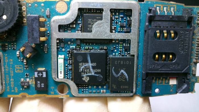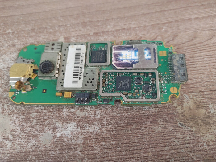 Чуть выше расположилась микросхема производства Epson. Её задачи разнятся от телефона к телефону, но в основном она выполняет роль контроллера камеры или дисплея. В некоторых других моделях, был дополнительный чип, который аппаратно декодировал MP3.