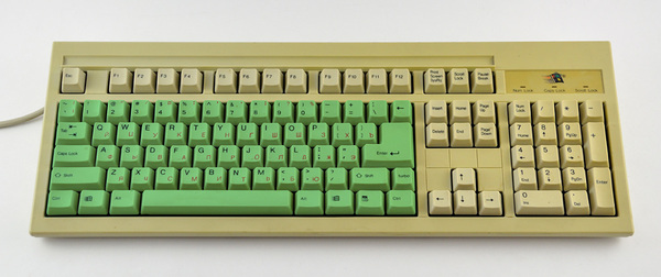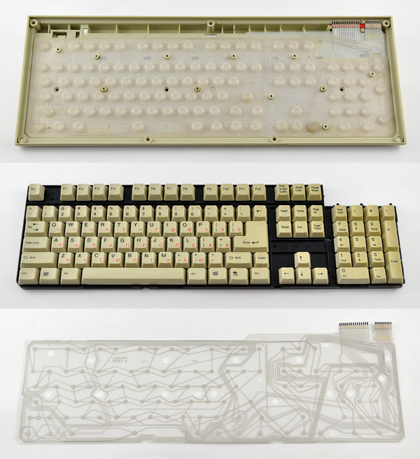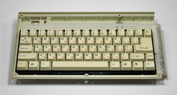 У неё удобная конструкция — по сути, блок клавиш представляет собой просто пластмассовую панель с отверстиями, в которые вставлены колпачки кнопок. К тому же она достаточно древняя сама по себе, и форма её кнопок отлично подойдёт для ретро-терминала. В дальнейшем кнопки, естественно, будут покрашены, и символы на них я нанесу заново.