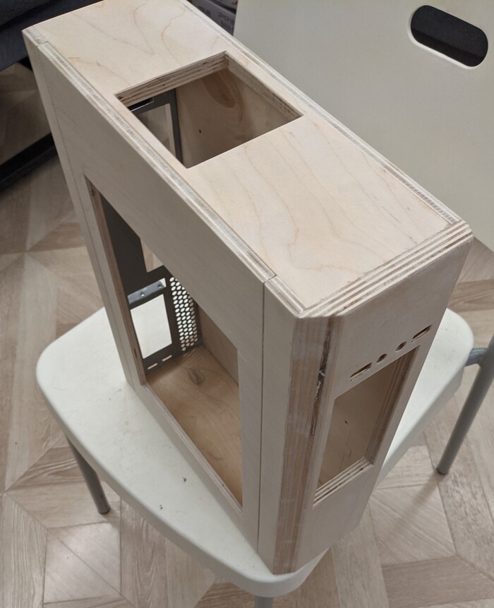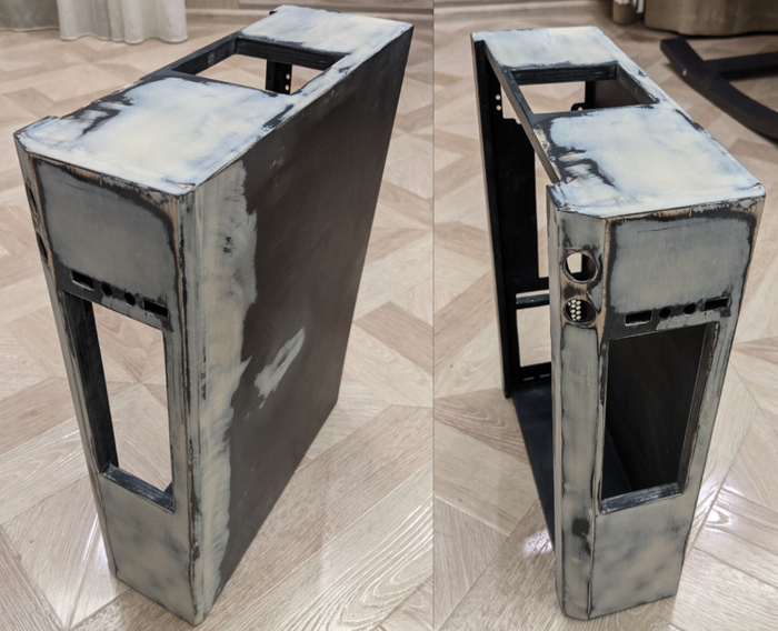 Особенно горжусь пазиками под ножки кронштейна видеокарты на правом краю - там пропилы дремелем, а потом большой плоской отверткой выгнул металл так, чтобы видяха вставлялась изнутри.