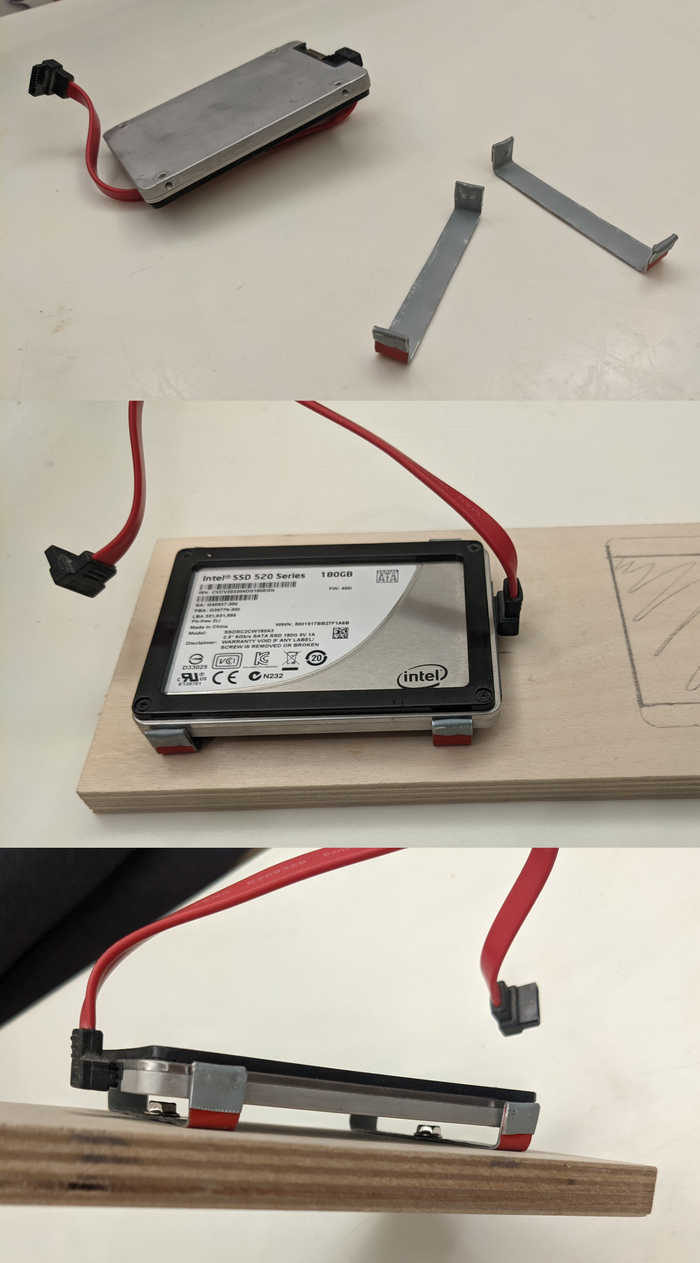 Диск у меня только один, 3.5 SSD, его расположил вертикально, плашмя на фасадной стенке, в самодельных кронштейнах из того же металла корпуса пк. На концах кронштейнов гвоздем выбил выступы, в которые диск вщелкивается.