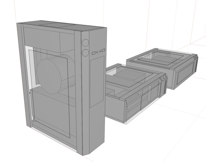 Дальше на программе Pro100 для проектирования мебели рисую чертеж. Замерил все компоненты и в виде параллелепипедов распихал по месту.