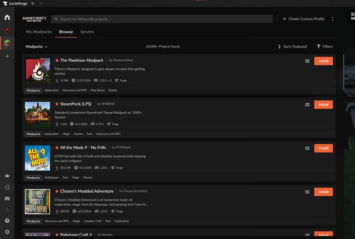 ■ На выбор вам будет предоставлено бесчисленное множество всякого. На любую тему, на любой уровень сложности, на любой компьютер. Тут есть всё начиная от "идеально оптимизированных паков на картофельные компухтеры" до гигантов, которые переворачивают игру с ног на голову и превращают её из песочницы-выживания в другой жанр. Для олдов: на Curseforge вы можете найти модпаки от той самой команды FTB Team.