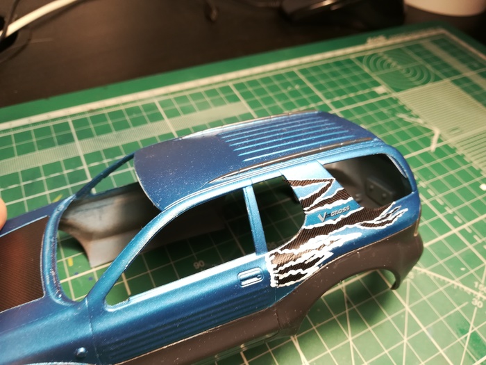 Так как все декали были смыты, я попыталась спасти хотя бы одну из них, поэтому наклеила скотч поверх. Конечно, переход получился не очень красивым. Но я люблю эксперименты, а ещё у меня есть лист карбона=)