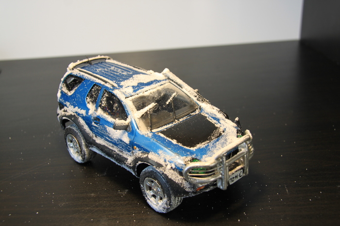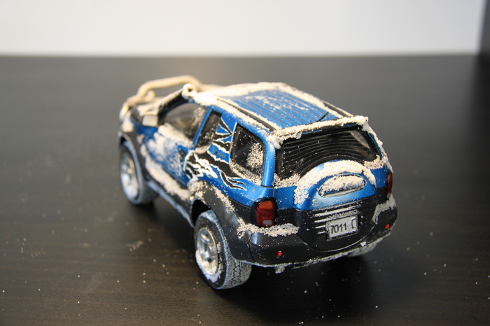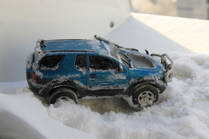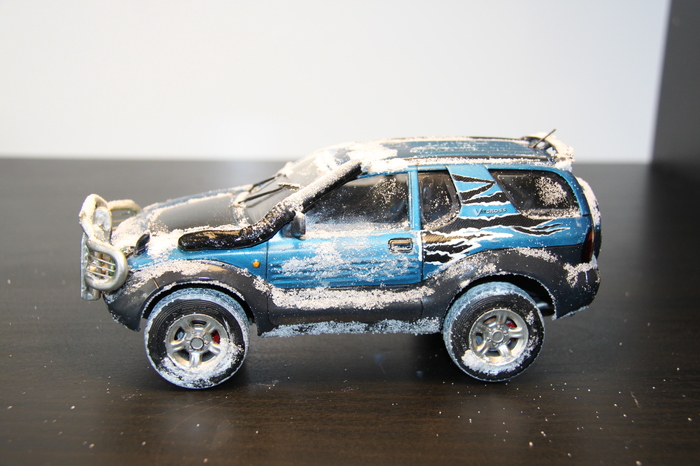 Я не была готова к третьей покраске, грязным делать авто не хотелось и тут я вспомнила, где живу - в Сибири. Идея сделать машину в снегу засела в моей голове и не давала спать. Я просматривала различные фото внедорожников в снегу, почерпнув море данных я загорелась ещё одной идеей - сделать шноркель. Он отлично маскировал некоторые косячки и придавал брутальность моей машинке.