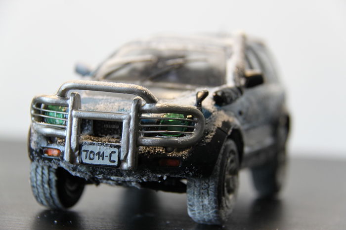Потом пересмотрела фото реальных машин и у некоторых увидела зеленые фары, покрасила. А увидев кенгурятники - загорелась сделать и его! Это интересная практика - пришлось научится "вытягивать" литники над свечкой)