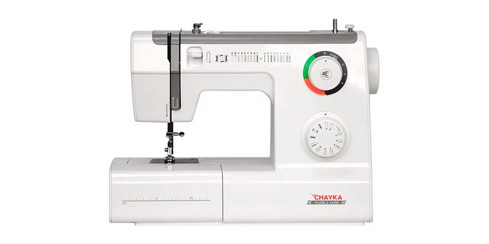 Продолжает рейтинг самая популярная модель в недорогой категории – Чайка 142М. Она выполнена в лаконичном дизайне, наделена понятной системой настроек, удобными подсказками на корпусе о намотке нити на шпульку и заправке, а также линейкой, начерченной вблизи рабочей части. Машинка оборудована горизонтальным катушечным стержнем, встроенным нитеобрезателем, съемной рукавной платформой и отсеком для хранения мелочей.