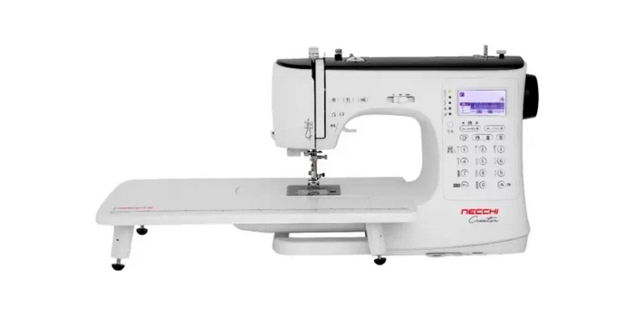 На седьмом месте рейтинга стоит швейная машина NECCHI 1300 с горизонтальным металлическим челноком с системой быстрой заправки нити QBT. Это обозначает, что после заправки можно сразу начинать шить без подъема нижней нити. У модели два катушкодержателя, чтобы легко менять катушки для намотки шпульки и использовать двойную иглу. Отдельно стоит выделить удобное отключение транспортера, что необходимо для вышивки и некоторых операций, а также высокий подъем лапки – до 13 мм, что является рекордным показателем среди аналогов. В комплекте предусмотрен большой набор лапок: для петли, универсальная, для молнии, для пуговиц, для атласных строчек.