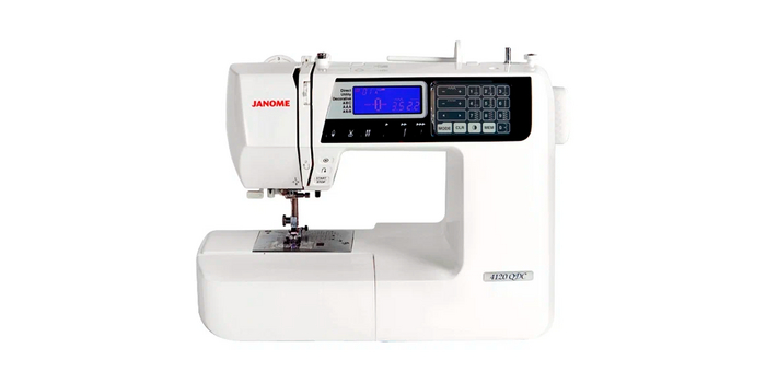 Лидером рейтинга стала Janome 4120 QDC – премиальная компьютерная швейная машинка с максимальными возможностями. Она наделена сенсорной панелью управления, информативным дисплеем, встроенной памятью и множеством автоматизированных функций. В частности, автоматическую закрепку, обрезку, шитье двойной иглой можно включить отдельной кнопкой.
