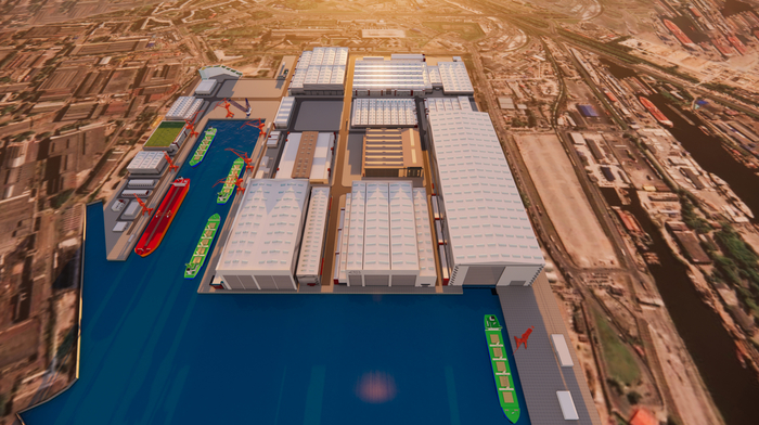 Под эту технологию создают и уникальную инфраструктуру. Сердцем будущего завода станет крытый сухой док высотой сто метров. Его будут обслуживать мощнейшие краны грузоподъёмностью до 900–1000 тонн. Крытый эллинг — стратегическое решение для Санкт-Петербурга. Он позволит работать в любую погоду, не прерывая технологический цикл в условиях морозов или осадков. Подобные сооружения в российской судостроительной практике ещё не возводились.