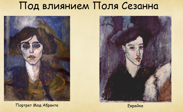 Картины «голубого» периода Пикассо, как и творчество Сезанна, сильно повлияли на живопись Модильяни тех лет, о чем свидетельствует портрет «Еврейка».