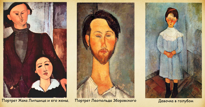 Все свое внимание Модильяни уделял портретам коллег и друзей, с которыми регулярно встречался в кафе «Ротонда»: портреты Диего Риверы, Хаима Сутина, Поля Гийома, Пабло Пикассо, Хуана Гриса.
