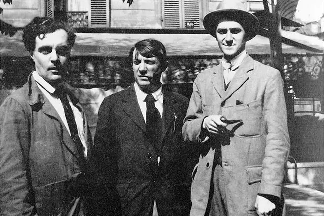 Амедео Модильяни, Пабло Пикассо и Андре Сальмон у входа в кафе "Ротонда", 1916 год