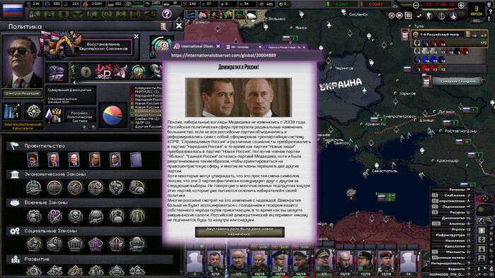 По сюжету мода на HOI4 в 2020 году был более серьёзный коронавирус и это привело сначала к гражданке в Саудовской Аравии, а затем, в США. Теперь у России и Китая развязаны руки. Если на выборах победит Единая Россия и победит в войне против европейского НАТО, то тогда западная Европа в порыве мести объединится в единый Европейский Союз и разросшемуся ОДКБ и БРИКС придётся воевать либо с Клаусом Швабом (злой капиталист-ультраглобалист в вакууме), либо против Адольфа Гюнетра Фелингера (который предлагал планы по деколонизации и """"освобождению"""" стран БРИКС)