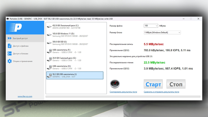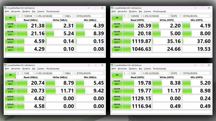 Синтетические бенчмарки показывают скорости чтения/записи равные ≈20/5 МБ/с, соответственно.