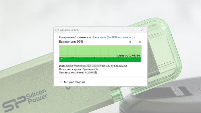 Фактический перенос данных (установочные дистрибутивы) на обозреваемую флешку Helios 101 показал скорость ≈6-7 МБ/с. Фактически этот же самый результат, что и тест на линейную запись в AIDA64.