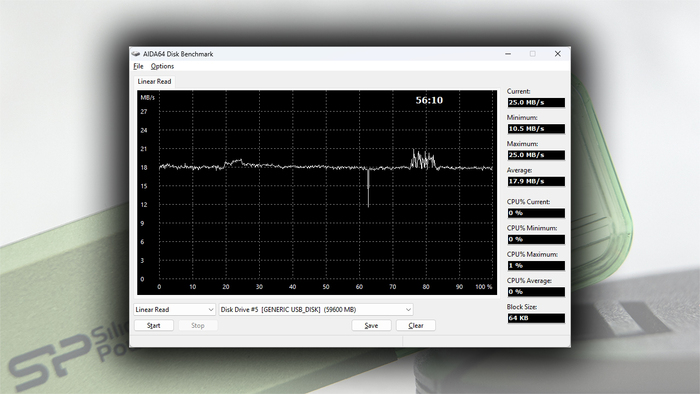 Скорость же линейного чтения (предварительно записанного целиком накопителя) составила ≈18 МБ/с.