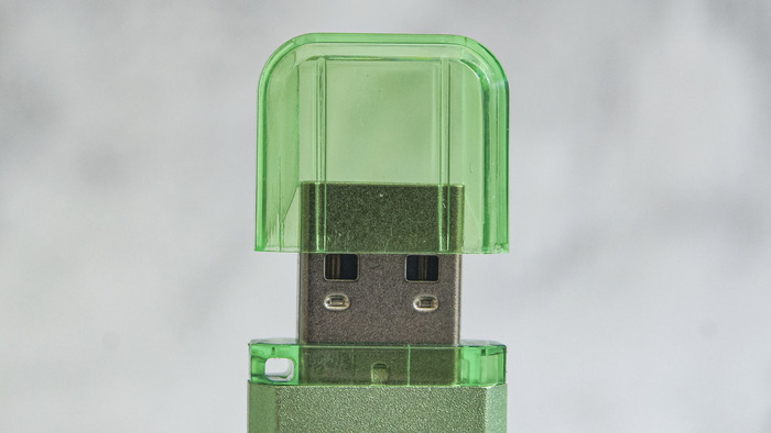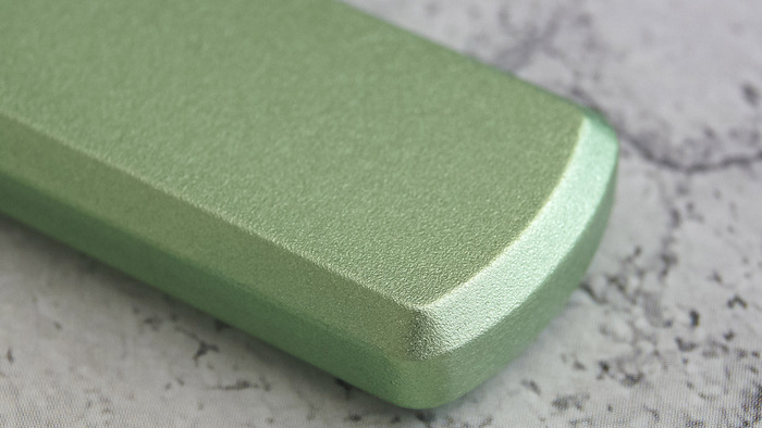 Поверхность алюминия имеет матовое покрытие, с мелкой текстурой, похожей на то, будто было подвергнуто пескоструйной обработке. Такое решение не только приятно тактильно (флешка не скользит в руках), но и практично: на корпусе не остаются отпечатки пальцев, а мелкие царапины появляются менее охотно. Цвет модели — насыщенный зеленый. Производитель называет этот цвет Apple Green. Он яркий, но не «кислотный» и переливается на свету благодаря вышеупомянутой мелкой текстуре.